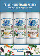 Die regionalen Produkte, das gute Land, die Bauern und Lieferanten aus der Nachbarschaft, der hohe Fleischanteil, die ausgewählten Wiesenkräuter und die schonend natürliche Herstellung ohne jegliche künstliche Zusatz-, Aroma- oder Konservierungsstoffe – all das macht die Heimatglück Hundemenüs zu einem echten artgerechten Gaumenschmaus für Ihren geliebten Vierbeiner.